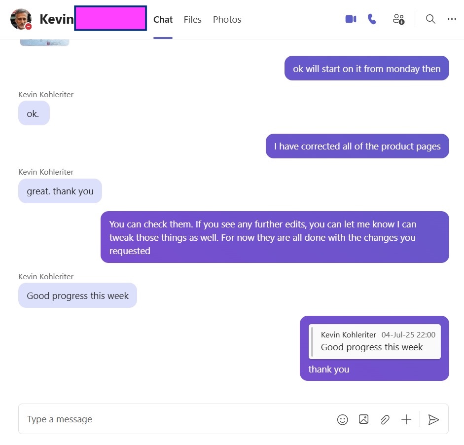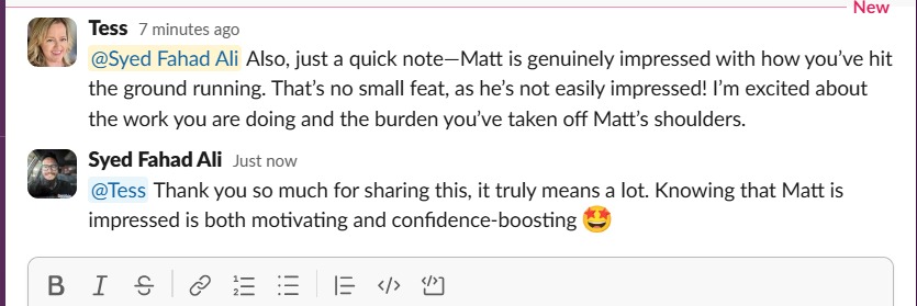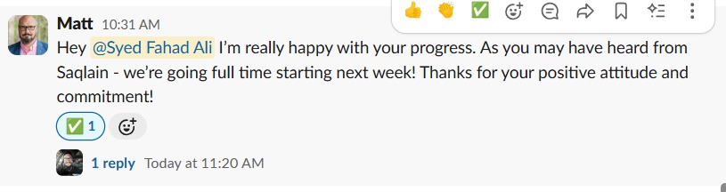 "Hey @Syed Fahad Ali, I’m really happy with your progress. As you may have heard from Saqlain – we’re going full time starting next week! Thanks for your positive attitude and commitment!"