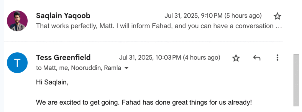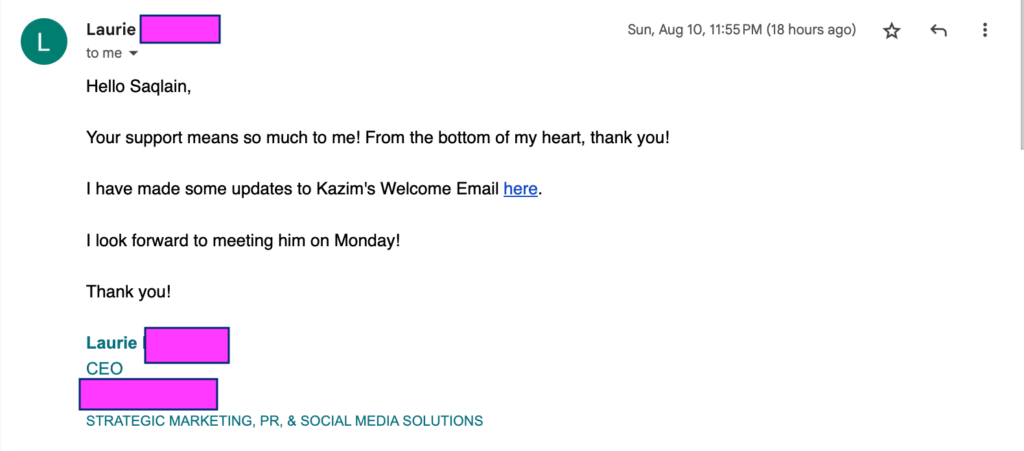 "Hello Saqlain, Your support means so much to me! From the bottom of my heart, thank you! I have made some updates to Kazim's Welcome Email [here]. I look forward to meeting him on Monday! Thank you!"