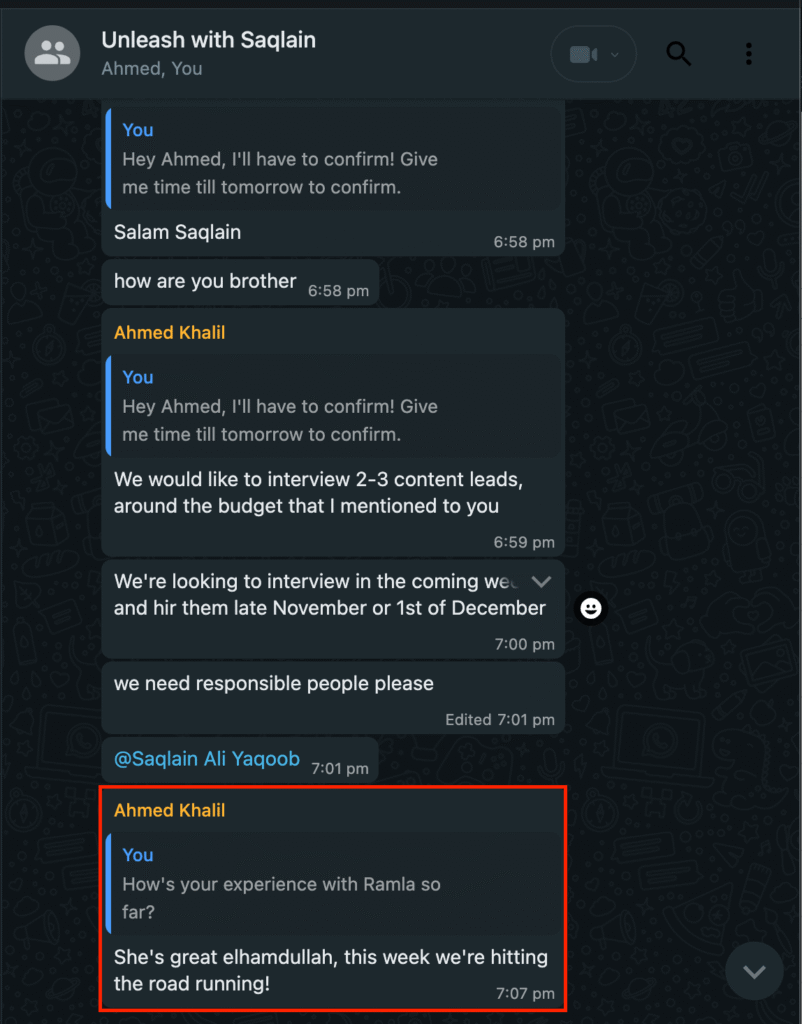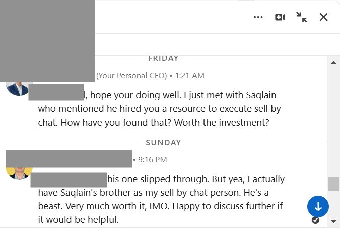 "Hi, hope you're doing well. I just met with Saqlain who mentioned he hired you a resource to execute sell by chat. How have you found that? Worth the investment?"