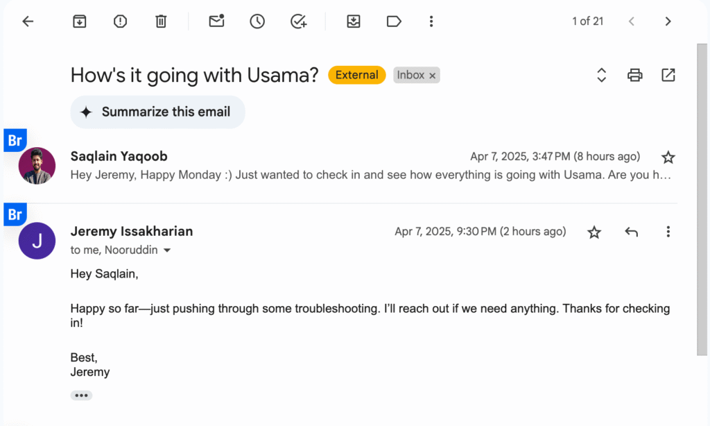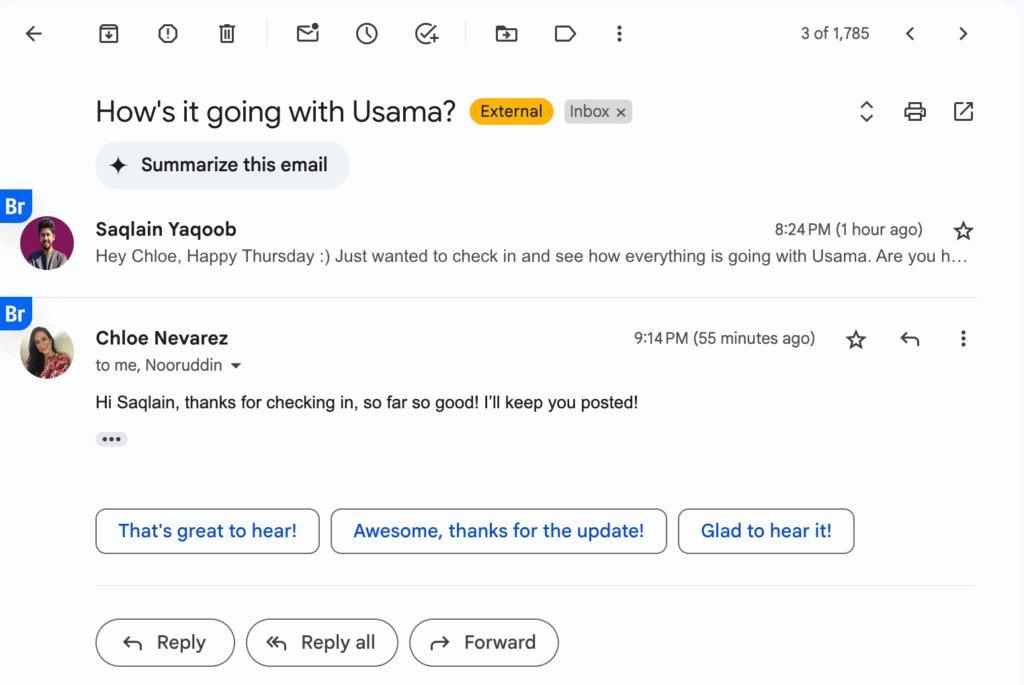 "Hey Chloe, Happy Thursday 🙂 Just wanted to check in and see how everything is going with Usama. Are you happy with the progress so far?"