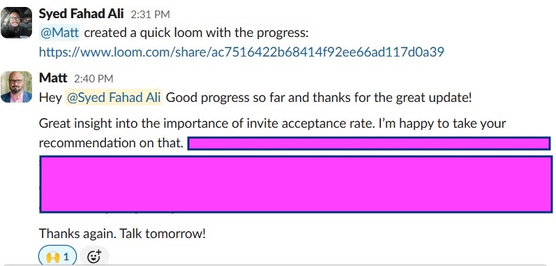 "Hey @Syed Fahad Ali, Good progress so far and thanks for the great update! Great insight into the importance of invite acceptance rate. I’m happy to take your recommendation on that."