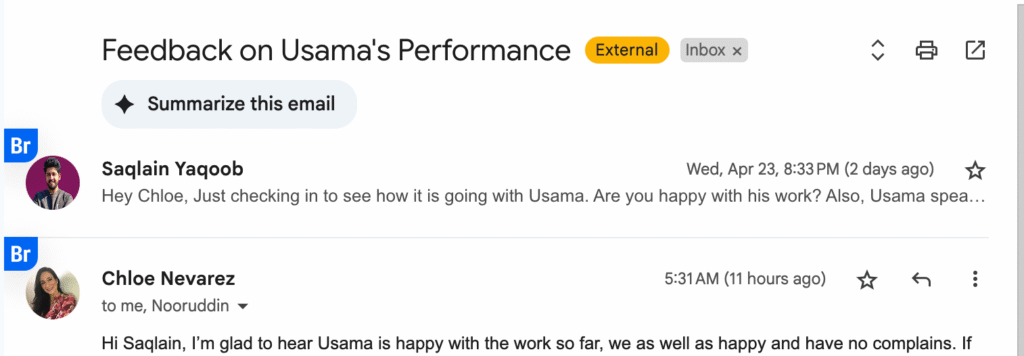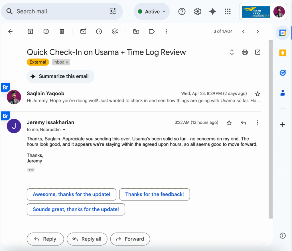 "Thanks, Saqlain. Appreciate you sending this over. Usama's been solid so far—no concerns on my end. The hours look good, and it appears we’re staying within the agreed-upon hours, so all seems good to move forward."