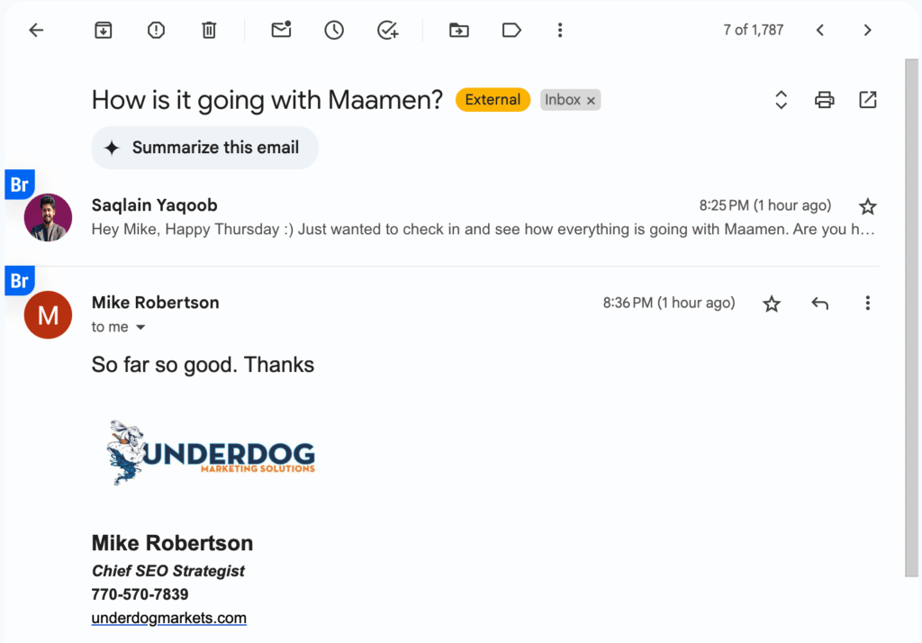 "Hey Mike, Happy Thursday 🙂 Just wanted to check in and see how everything is going with Maamen. Are you happy with the progress so far?"