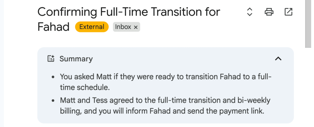 "You asked Matt if they were ready to transition Fahad to a full-time schedule. Matt and Tess agreed to the full-time transition and bi-weekly billing, and you will inform Fahad and send the payment link."