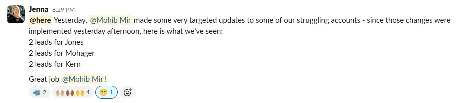 "Yesterday, @Mohib Mir made some very targeted updates to some of our struggling accounts - since those changes were implemented yesterday afternoon, here is what we've seen: