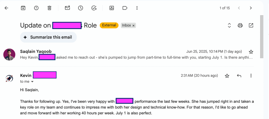 "I've been very happy with performance the last few weeks. She has jumped right in and taken a key role on my team and continues to impress me with both her design and technical know-how. For that reason, I'd like to go ahead and move forward with her working 40 hours per week. July 1 is also perfect."
