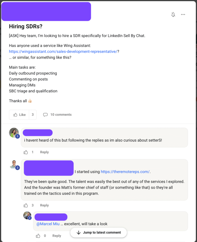"I started using https://theremotereps.com/. They've been quite good. The talent was easily the best out of any of the services I explored. And the founder was Matt's former chief of staff (or something like that) so they're all trained on the tactics used in this program."