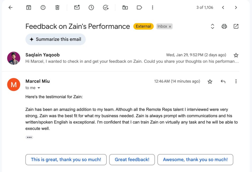 "Zain has been an amazing addition to my team. Although all the Remote Reps talent I interviewed were very strong, Zain was the best fit for what my business needed. Zain is always prompt with communications and his written/spoken English is exceptional. I’m confident that I can train Zain on virtually any task and he will be able to execute well."