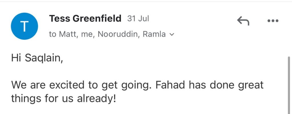 "Hi Saqlain, We are excited to get going. Fahad has done great things for us already!"