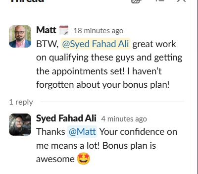 "BTW, @Syed Fahad Ali, great work on qualifying these guys and getting the appointments set! I haven’t forgotten about your bonus plan!"