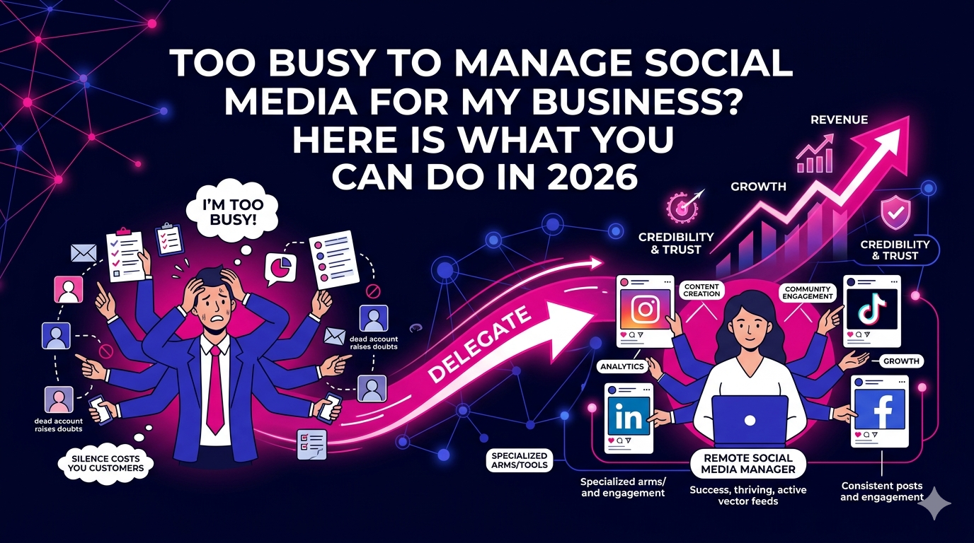If you have ever caught yourself saying, “I am too busy to manage social media for my business,” you are not alone. In 2026, running a business means wearing dozens of hats at once. Between client calls, fulfillment, hiring, and strategy, social media often falls to the bottom of the priority list. But here is the problem: your audience does not know that. They just see silence, and silence costs you customers.