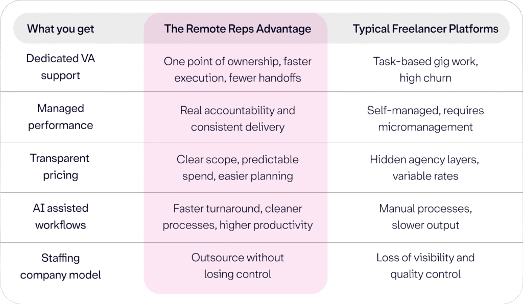 Many virtual assistant firms operate like marketplaces. You get access to people, but not a system. We operate like a virtual assistant staffing company with structured onboarding and ongoing performance oversight so execution stays consistent.